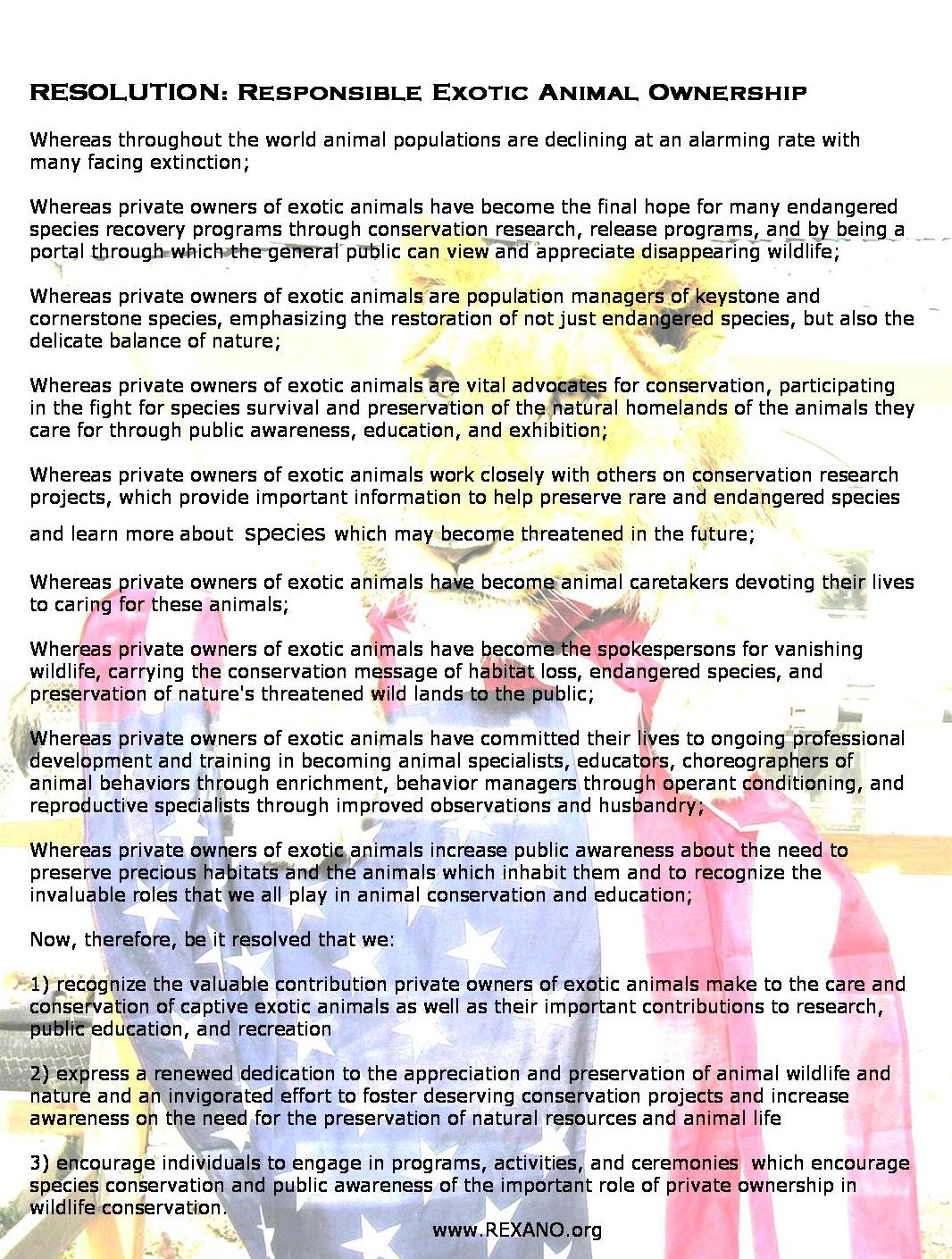 RESOLUTION: Responsible Exotic Animal Ownership (PDF file), Summer 2007