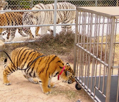 Let the inquisitive cat go in and explore the cages used and territorially marked/sprayed by full grown tigers and lions.