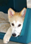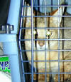 This wolf cub is enjoying his dog crate where he feels safe. Plastic crates and wire cages made for domestic dogs and cats come in many colors, sizes and wire strength. They are perfect for wolves and other non domestic canines, as well as for other smaller  mammals,  such as small species of exotic and wild felines, including cubs to juvenile big cats.