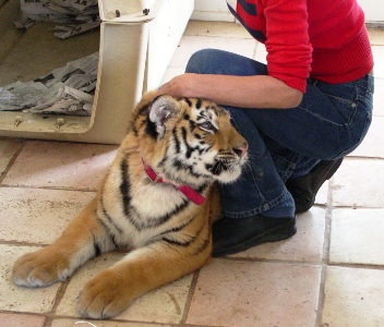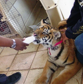 Also give them their favorite treat, milk bottle for this baby tiger, near the crate. Keep the association with the crate as positive and fun as you can.