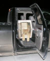 Having this crate in the bed of a pick up truck could be very dangerous, even if the weather is good, crate door could malfunction and the cat could have a direct access to the public. By having it inside the truck, even if the crate door malfunctions, the cat is still contained inside the truck cabin. (note, this picture, as many others on this website, was taken inside a fenced compound)