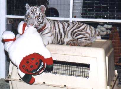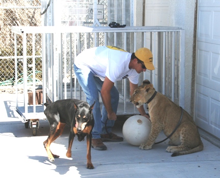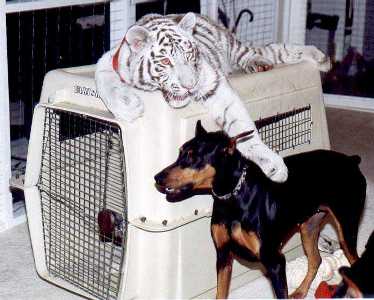 Wild and exotic cats like to sit up high, and big dog crate can support a juvenile tiger. This tiger and Doberman were great friends and were raised together.
