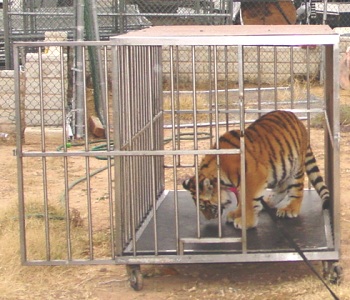 Animals used in educational or entertaining exhibition get used to their transport cages in no time and it becomes their normal routine.