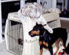Make being near the transport cage a triple fun: human 'dad', buddy Doberman and big white toy ball.