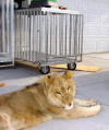 Young lion resting in a transport cage that is still too big for him, however, he routinely used it to play with his toys or take a nap in it.