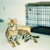 If your exotic cat, like this serval, is an indoor pet , keep the transport cages in their favorite spot, so they get used seeing them and not fear them. Put their favorite toy or treat inside so they will look forward going in on their own, stress free.
